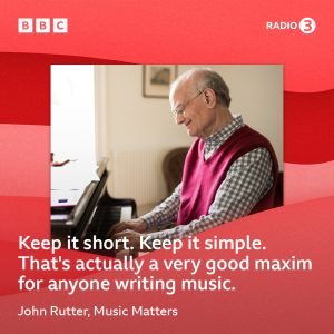 Tom Service visits the composer at his home in rural Cambridgeshire to try to learn the secret of writing a great carol, and to chat about an illustrious career that has also included major choral works such as his Requiem and Gloria, and the large-scale Mass of the Children, written in 2003 following the sudden death of Rutter’s son Christopher at the age of 19. We also drop in on a rehearsal with the Bach Choir in London, as John prepares them for last year’s gala Christmas Celebration concert at the Royal Albert Hall.”